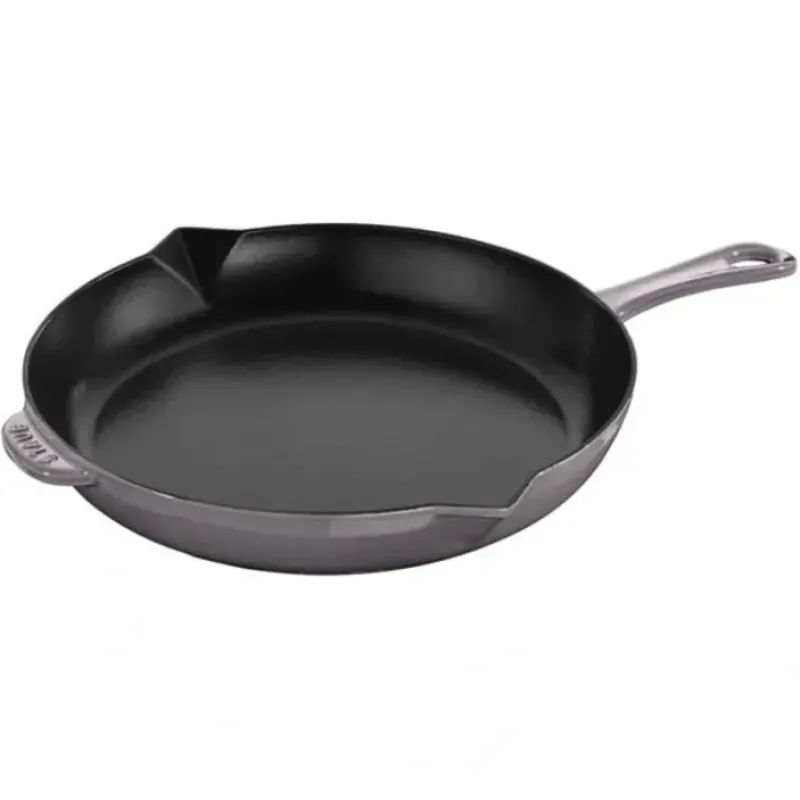 The Staub fry pan browns foods beautifully. be it chicken breasts. potatoes. or bacon. The enameled black matte interior imparts texture. promoting exceptional browning. Cast iron offers steady. even heat distribution. so the temperature of the pan won’t drop as you cook. Low. curved sides make it easy to flip the food. which releases easily.Staub enameled cast iron cookware is the choice of the world’s best chefs. With exceptional durability. it is perfect for day-to-day use in both gourmet home kitchens and prestigious restaurants around the world. Each piece transitions beautifully from the kitchen to the table. Built to last a lifetime. these heirloom pieces can be passed from generation to generation.