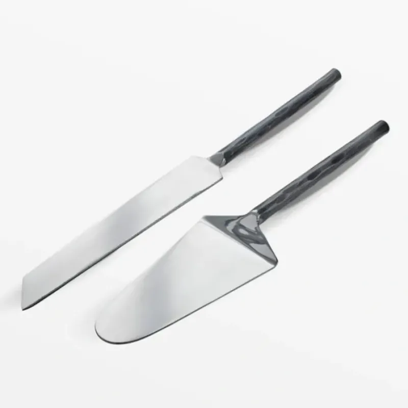 Perfect for cutting and serving birthday or wedding cake Two-piece set includes: Cake Knife. Cake Server Packaged in a soft eco-friendly cotton cloth for protection and stylish gift-giving Dishwasher safe using a mild detergent (we recommend hand washing/drying) Serve cake and pie to dinner guests with this charming serving set.
