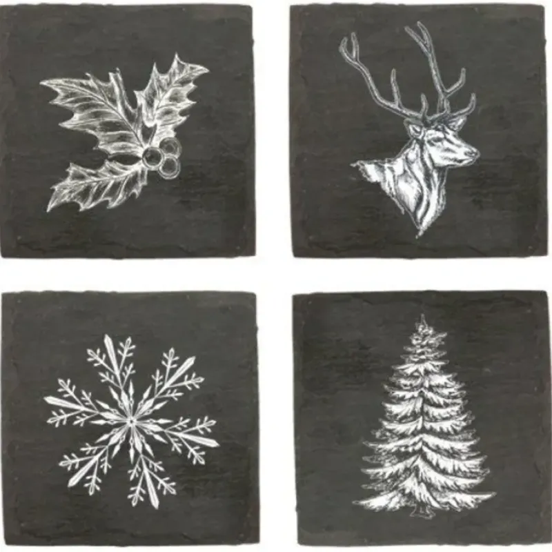 A classic and elegant set of 4 black slate coasters each with a seasonal image. The natural slate also means your guests can write their names on their coasters with chalk