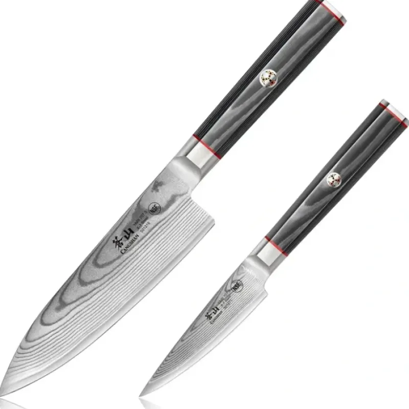 - Hand sharpened to a 16-degree angle per side. HRC 58 +/- 2 on the Rockwell Hardness Scale. Forged from 67 layers of Cangshan’s proprietary X-7 Damascus Steel.