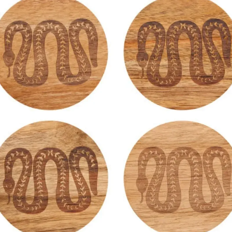 - Made from durable Acacia wood. These coasters are lazer engraved with our unique Imprint designs. Engraving is relatively shallow but texture can easily be felt. All four patterns within the set are the same (not assorted).