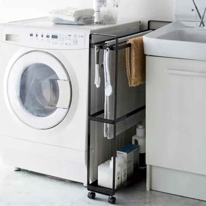 This thin profile storage cart is a triple threat. Use it as a towel or bath mat rack. The super thin design will slide between or alongside bathroom appliances and sinks. Or. use the hanging bars and hooks to store cleaning tools. detergents. and cleaners. Feeling artsy? Stow craft supplies and craft paper on this versatile rolling cart!
