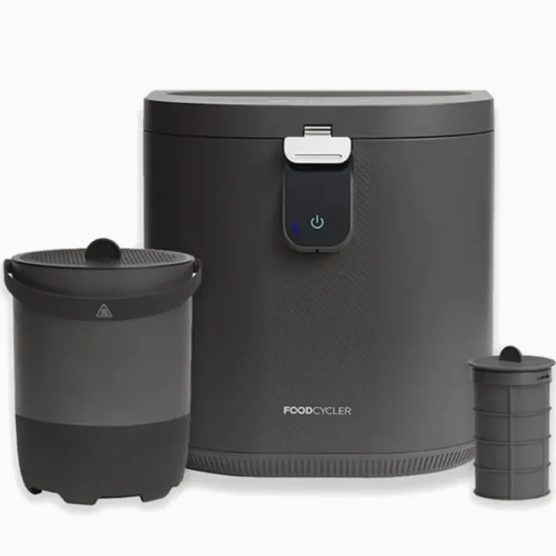 Our compact food recycler reduces food waste to a fraction of its original volume overnight.