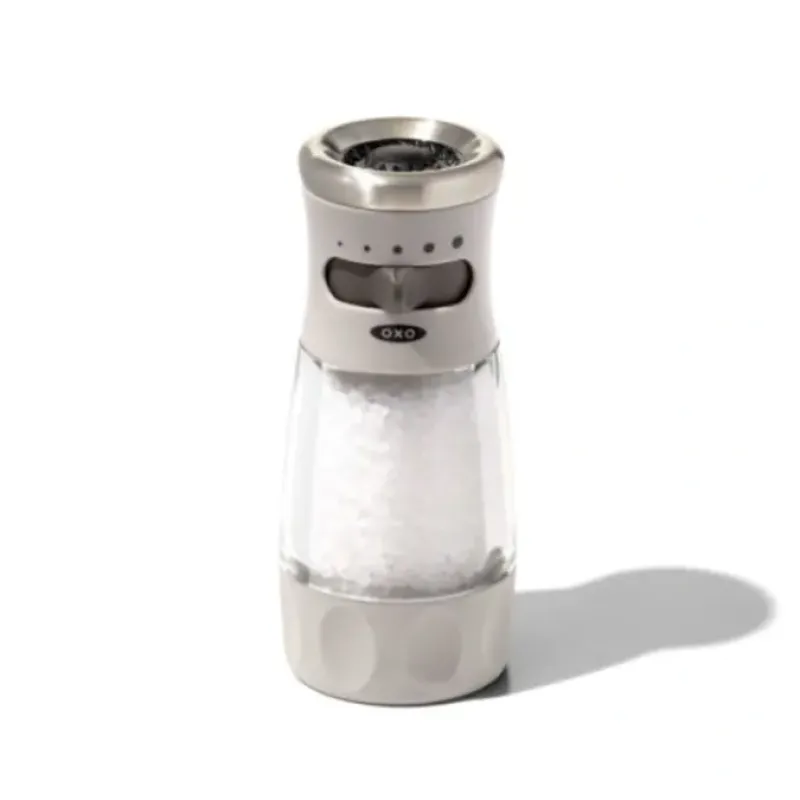 The OXO Good Grips Contoured Mess-Free Salt Grinder dispenses from the top. for less mess on your counters. Slide the tab to choose from five grind-size options. Made from non-corrosive ceramic. the durable grinder mechanism won’t absorb flavors or odors. so it works for all types of peppercorns. salts. and whole spices like cumin. coriander and cloves. An airtight lid keeps spices fresh and dry while the non-slip grip on the base allows for easy. comfortable use. Our manual Grinder has stainless steel accents and a clear acrylic body. so you’ll know when it’s time to refill. Comes pre-filled with coarse salt. Hand wash only.