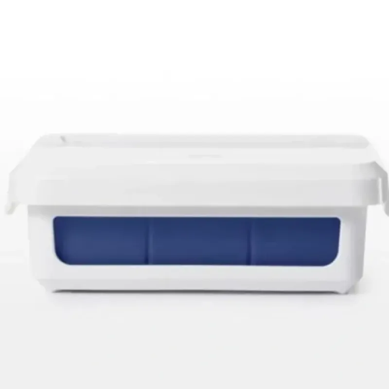 Makes six large (1 3/4″ square) cubes that keep drinks cold and won’t dilute them. Flexible silicone allows for easy removal. while the frame provides support during filling. moving and storage. Cover keeps out odors and allows for stacking multiple trays.