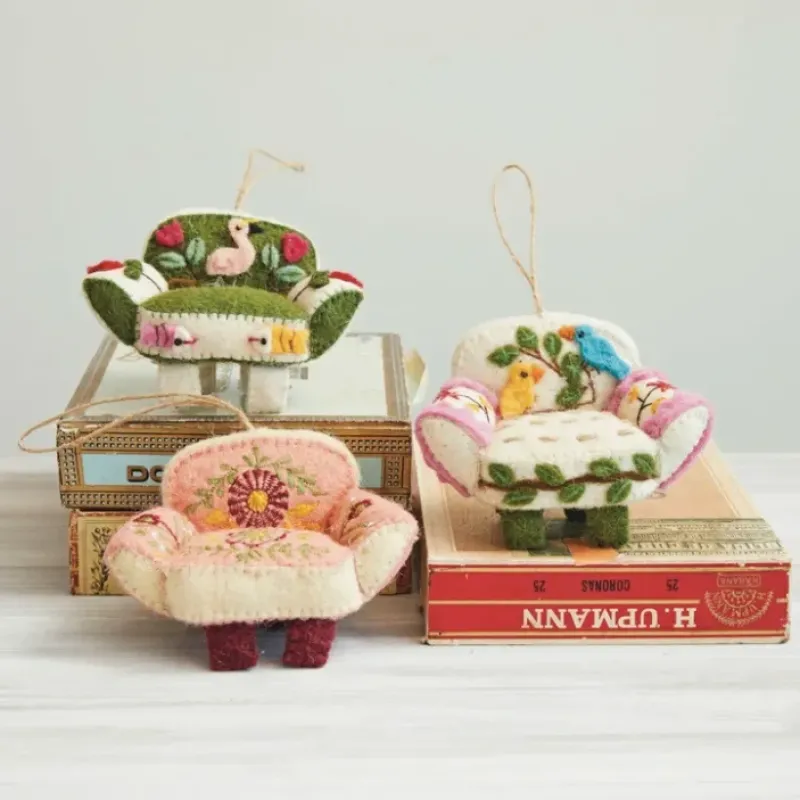 This handmade wool felt sofa chair ornament set with applique and hand-embroidery is a cozy and cute way to add some personality and flair to the home. The set includes 3 sofa chair ornaments in multicolor. each with a different applique and hand-embroidery design. The ornaments feature a soft and durable wool felt fabric. with metal legs and a jute string loop for easy hanging. They are embellished with cute details. They are made of natural wool and organic materials. making them eco-friendly and safe for the family. Decorate the wall. shelf. or window. or use them as a gift or a toy as these ornaments will bring a touch of warmth and charm to any space. They also make a great gift for friends and family who love sofa chairs or handmade crafts. A cozy and cute set of sofa chair ornaments with multicolor wool felt. metal legs. and jute string loops. A lovely accessory for any vintage. shabby chic. or cottage style decor. Ideal for hanging on the wall. shelf. or window. or using as a gift or a toy.