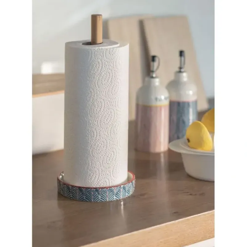 With the paper towl holder you have fresh kitchen paper always within reach and the ideal helper in your kitchen. The holder consists of a round plate made of stoneware with detailed prints for good stability and a high rod made of wood. over which the kitchen roll is placed.