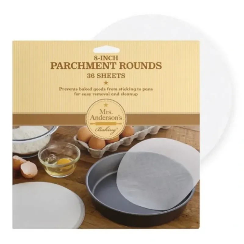 - Mrs. Anderson’s Non-Stick Parchment Cake Rounds keep baked goods from sticking without greasing baking pans or the use of oils