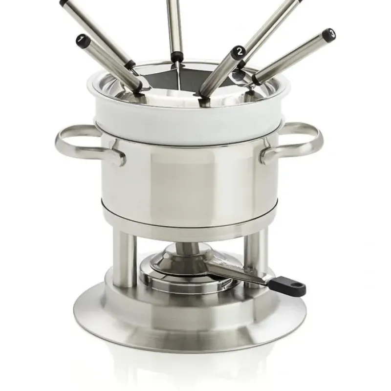 This sophisticated. all-in-one set for meat. cheese and chocolate fondue features a pot and warmer/burner in gleaming stainless steel with a removable ceramic insert for ultimate versatility. The smaller diameter allows the oil to remain above 350 degrees without spattering. Set includes six numbered forks.