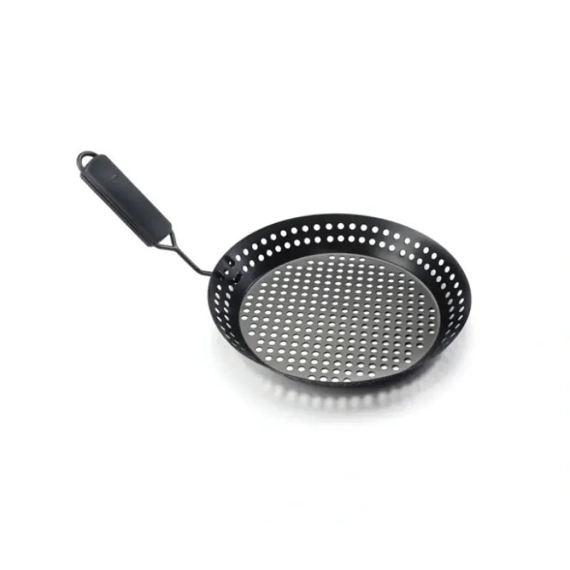 Time to flip out in front of your guests with this non-stick number. The PTFE/PFOA free non-stick coating and removable soft grip handle make for an easy clean-up and provides durability. The skillet’s perforated grilling surface ensures consistent cooking and enhances food’s natural flavors. while allowing you to grill veggies and shrimp without skewers and without fear of falling through the grates. The featured folding handle permits the skillet to be left on the grill top while cooking. Grill to perfection with this versatile skillet. built to impress.