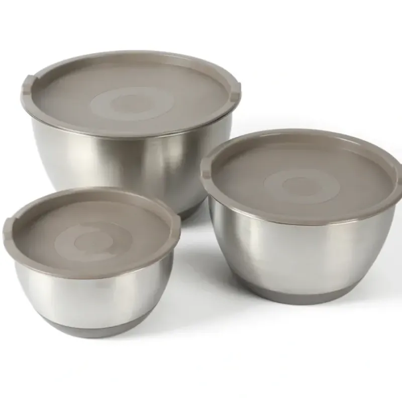 The best recipes are not just made from fresh ingredients; they are made in high-quality kitchenware to bring out their natural flavors and allow them to mix with other ingredients. High-quality stainless steel does not impact the flavors of ingredients. especially tomatoes or anything acidic. The Rhinewell Mixing Bowls are made from non-reactive stainless steel so they do not leave any metallic aftertaste in your food. salad dressings. batters. and more. Each bowl features a non-slip silicone base to provide stability and support and interior fill lines to provide accurate measurements. The airtight lids are BPA-free. ensuring that your food is safe and dry. When not in use. nest these bowls neatly to save space in your storage. Dishwasher safe. Do not microwave.Embrace thoughtfully designed home essentials from America’s most trusted lifestyle expert. Martha Stewart. Step into her exquisite and iconic world filled with a curation of high-quality products to prep. cook. bake. serve. and enjoy. All crafted to elevate everyday homemaking and seasonal entertaining. these kitchen and tabletop pieces blend style and performance. inspiring avid hosts and home cooks to set stylish tables. serve up delicious meals. and create spectacular memories.WHAT’S IN THE BOX: Three mixing bowls with Pplypropylene lids (1.5 quarts. 3 quarts. 5 quarts)STAINLESS STEEL CONSTRUCTION: Durable stainless steel bowls offer versatility to perform any food prep task — from mixing batters and whisking vinaigrettes to marinating meat and making sourdoughNON-SLIP BASES: Sturdy rubber bases provide support and stabilityINTERIOR FILL LINES: Etched capacity marks for easy reading and measuringSTACKABLE SET: Nesting bowls save space for a compact and clutter-free storageBPA-FREE LIDS: Snap-tight lids help keep contents safe and dry