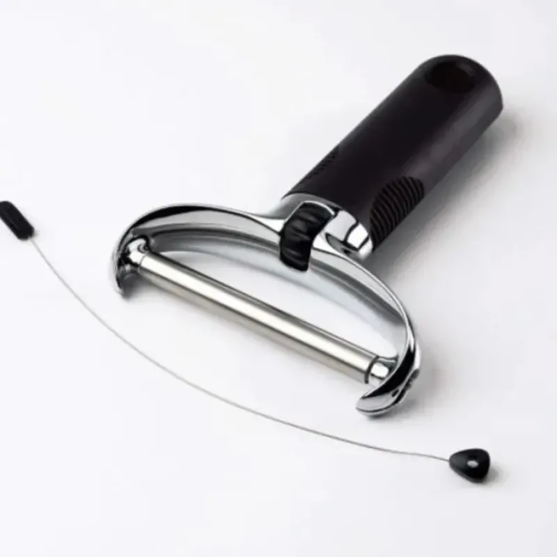 The stainless steel wire on the Wire Cheese Slicer is easy to load and tightens into place with the convenient tensioning wheel. The sturdy. die-cast zinc construction and soft. comfortable handle make it a workhorse at parties. Includes two replacement wires.