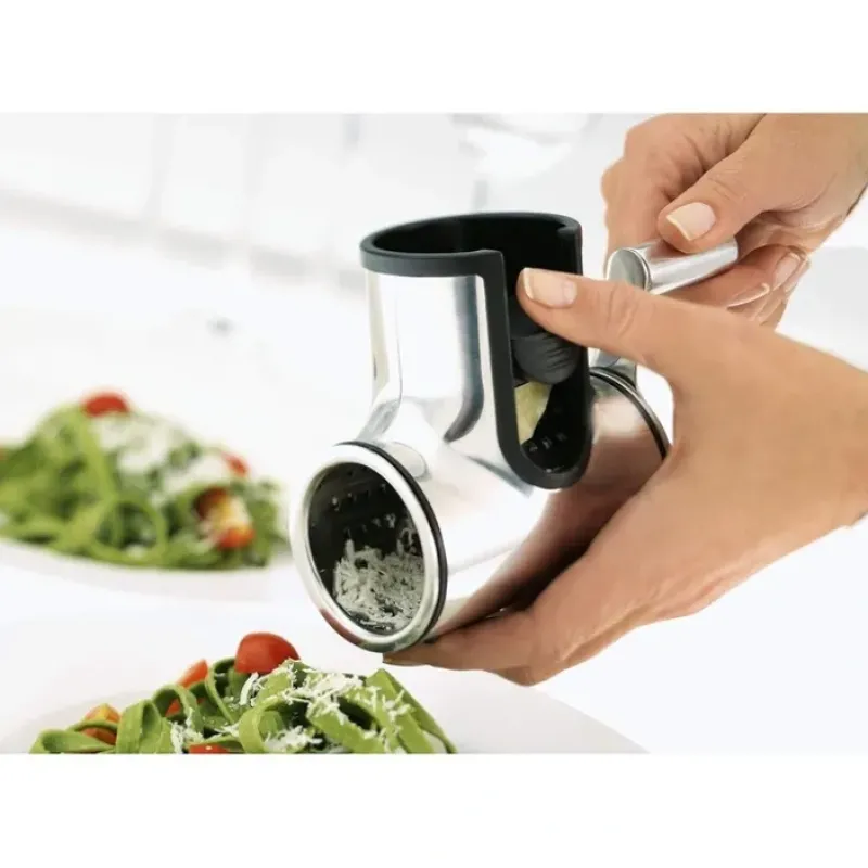 The high quality Rosle Cheese Grinder with drum is ideal for fast and efficient grating of cheese and chocolate – a real eye-catcher in the kitchen and on the dining table.The fine grating insert with sharpened grating plate produces the best grating results – simply insert the cheese piece. place the pressure lid. press down with thumb and grate hard cheese or chocolate by turning the crank – cheese slicing effortlessly for right- and left-handed users